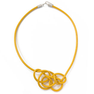 I love working with electrical wire, I love the way it holds a shape and the colours available. I use a knitting technique on a lot of the pieces which combined with the resistance of the electrical wire creates a kind of organised chaos. It can be unpredictable and the outcomes surprise me sometimes which I love and makes each piece so unique. All pieces are finish with handmade silver components.